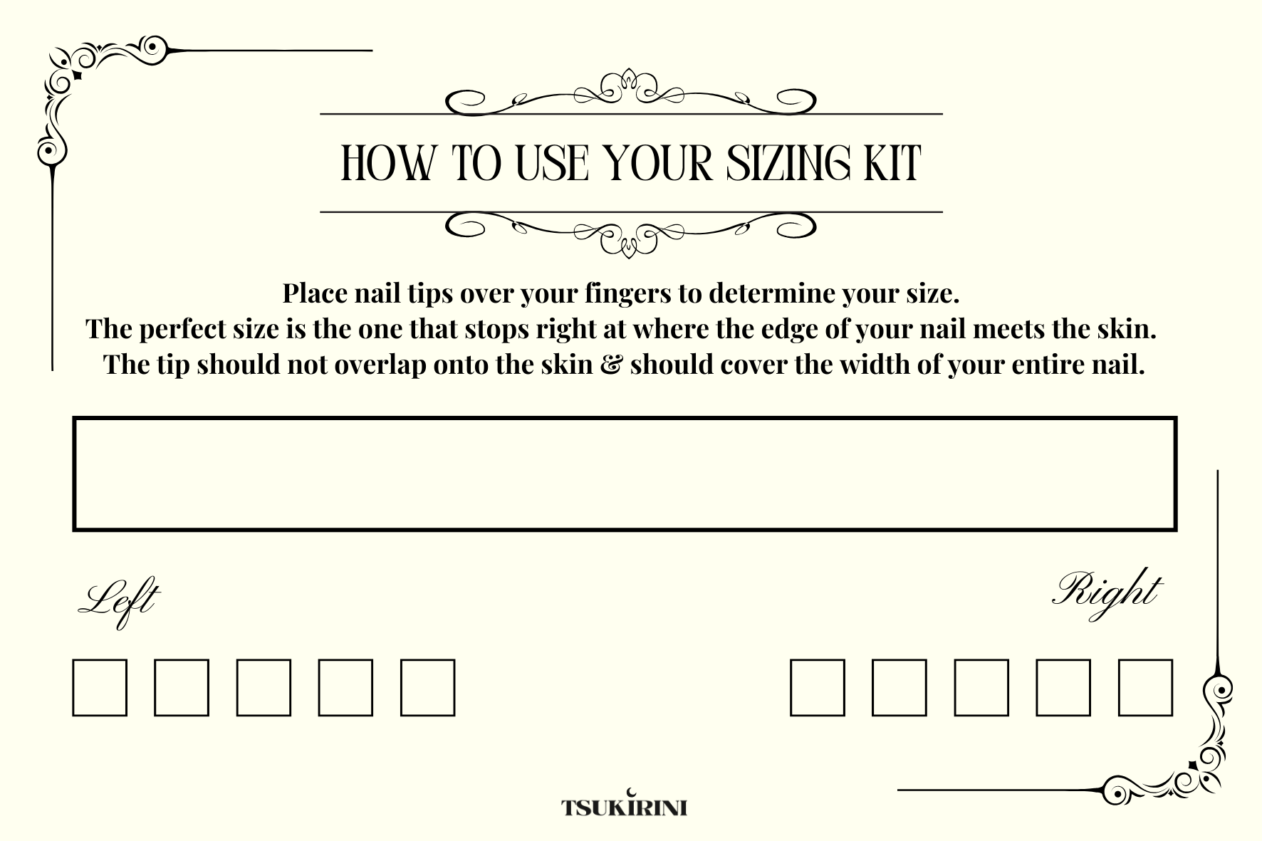 When you receive the sizing kit card, the blank rectangular shape in the middle will be used to glue the set of nails tip on, while the next section labeled "Left" & "Right" is for you to write down your sizes for each of your finger.